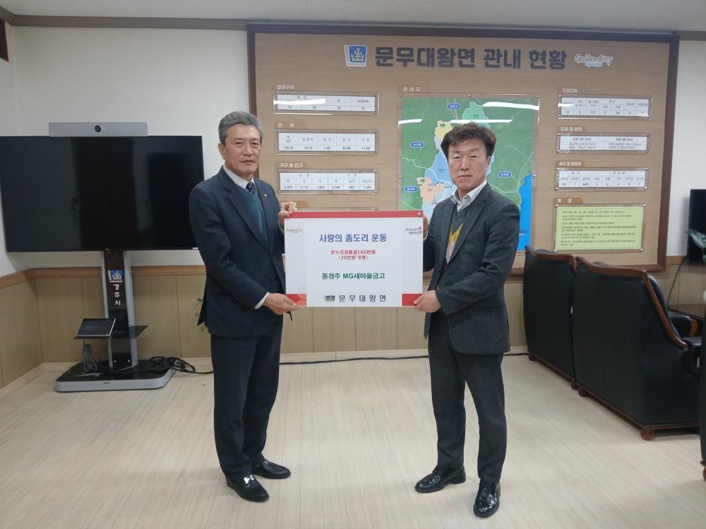 임정택 문무대왕면장은 “매년 따뜻한 마음으로 이웃과 함께해주시는 동경주새마을금고 모든 관계자분들께 감사의 인사를 드리며, 앞으로도 믿고 찾는 우리지역 서민금융으로 더불어 사는 지역사회를 위해 꾸준히 사랑을 베풀어 주시기를 바란다.” 감사의 뜻을 전했다.